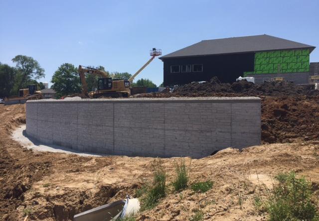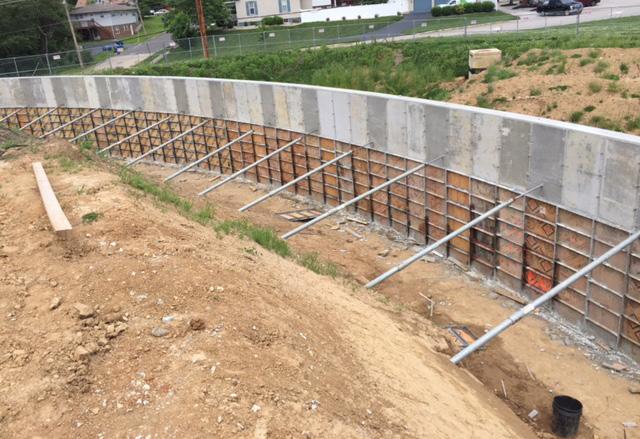 A curved concrete retaining wall was needed for a retention basin area at the new 51,000 square foot public safety building. The retaining wall project was a design-build and Foundation Supportworks by Woods was selected based on previous experience with similar projects. The proposed retaining wall was 10 feet high by 114 feet long with tiebacks for lateral support. The tiebacks would be installed prior to the construction of the wall, then embedded within the wall when the concrete was placed. A subsurface soil investigation showed that the proposed retaining wall tiebacks would bear in medium dense sand.