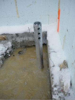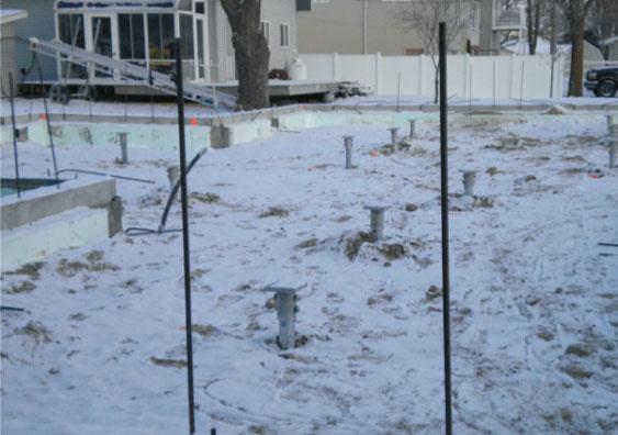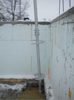 Innovative Foundation Supportworks installed a combination of both retrofit and new construction helical piers to stabilize the existing foundation and provide support for the interior floor slab. Twenty-three (23) Foundation Supportworks Model 288 Helical Piers were installed to permanently stabilize the existing foundation. The piers were advanced to depths of over 21 feet and to estimated ultimate capacities of over 70,000 pounds. L-shaped foundation brackets were then positioned below and against the footings to effectively stabilize the existing foundation. Fourteen (14) additional piers were installed in a new construction application where concrete would be poured for deck supports and the main floor slab. The piers in these locations were designed to support the concrete additions in order to prevent future settlement. Despite the wet and winter weather conditions, the 37 helical piers were installed in less than five days, allowing the project to remain on schedule. This gave both the homebuilder and future homeowner peace of mind knowing the foundation was permanently stabilized.
