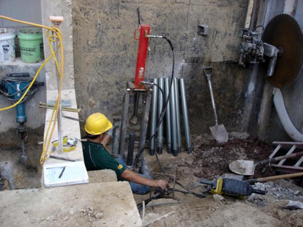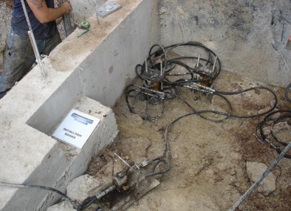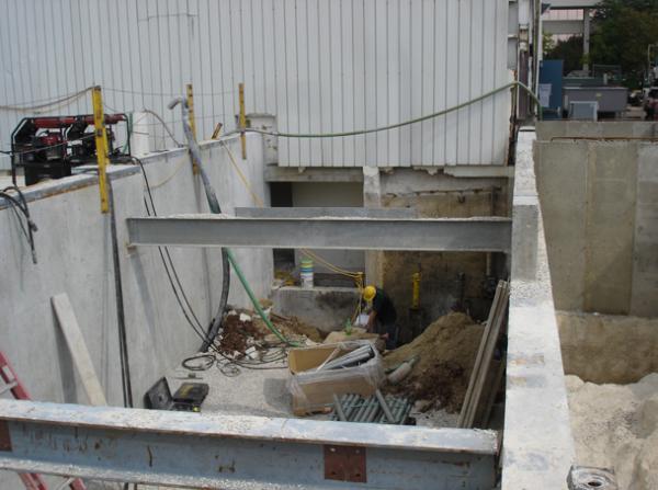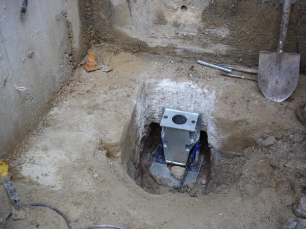 September 2009 - The existing YMCA building was constructed in the 1970’s and generally consists of 12-foot high by 12-inch thick poured concrete foundation walls with integral column supports, 17-inch thick spread footings, and a steel-framed superstructure. Construction of a new 14 million dollar addition began in 2009 to house a new child care area, locker rooms, workout studios, and swimming pool. The design of the addition added 160 kips of structural load to one of the existing building columns. Two options were considered to provide the necessary support of this column, helical piles and hydraulically driven push piers. Only smaller, portable or hand-held equipment could be used given the limited access both inside and outside the existing building. Hydraulically-driven push piers were selected due to the relative ease of installation over the helical piers and the ability to load test each pier during the installation process.