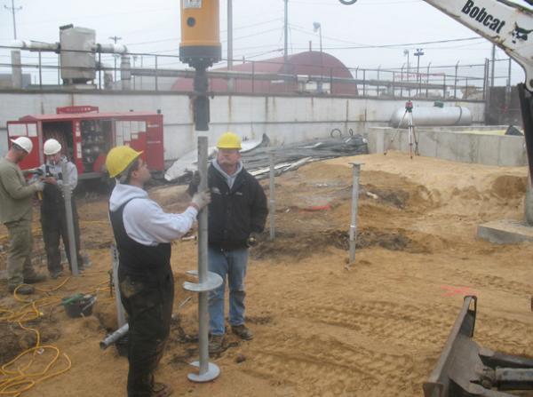 The foundation design included 18 helical piles sized accordingly to support a working load of 25 kips. A helical pile configuration consisting of a 2 7/8-inch outside diameter round shaft with a 10-12 double-helix lead section was selected. The density/strength of the alluvial sand also proved variable across the approximate 41-foot length of the foundation, with depths of the helical piles ranging from about 25 feet to 50 feet from one end to the other. Ultimate capacities of the production piles were estimated by correlation to installation torque and were at least twice the design working load (FOS ≥ 2). Installation of the 18 helical piles was completed in less than two days.