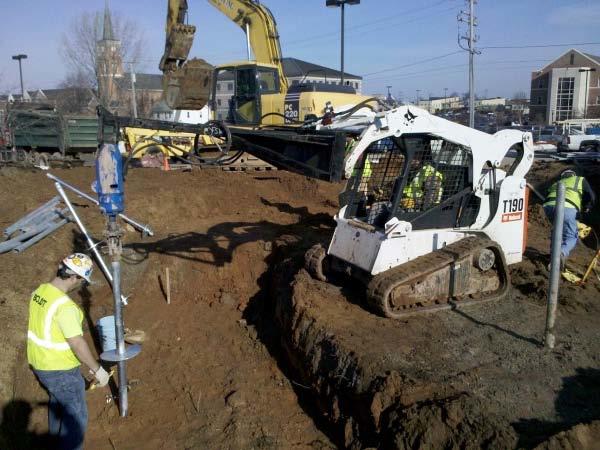 March 2011 -St. Norbert College planned a $1,175,000 addition and renovation to their existing admission center. The new addition consisted of a 60-foot diameter rotunda to be supported on deep pile foundations and grade beams. A small area of the addition included a stairwell to connect the main floor of the rotunda to the basement level of the existing building. The bottoms of the grade beams stepped up from below the basement level to four feet below grade for frost protection. The geotechnical investigation included the advancement of three soil borings, with one boring located in the area of the rotunda addition. The soil profile observed at this location consisted of 5.2 feet of uncontrolled fill underlain by soft to medium stiff clay to approximately 20 feet. Very stiff to hard clay was then sampled from 20 to 27.5 feet over an apparent weaker clay layer with an SPT N-value of 4 blows per foot. Since the boring terminated at a depth of 30 feet, the thickness of this weaker layer was not determined. A helical test probe was performed to further characterize the thickness of the very stiff to hard clay stratum and the soil conditions below the bottom of the boring. The helical test probe identified relatively soft soils from the bottom of the test boring to a depth of at least 42 feet. The deep foundation option would therefore bear within the very stiff to hard clay from 20 to 27 feet, or likely extend to depths exceeding 42 feet. Helical piles were selected as the ideal option since the helix plate size and spacing could be designed to bear in the very stiff to hard clay layer and support the design working load of 15 kips.