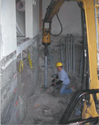 Helical piles installed in limited access area inside garage, 8 feet below grade