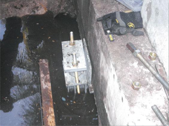 Retrofit brackets positioned against and below existing grade beams (ponded water within excavation)