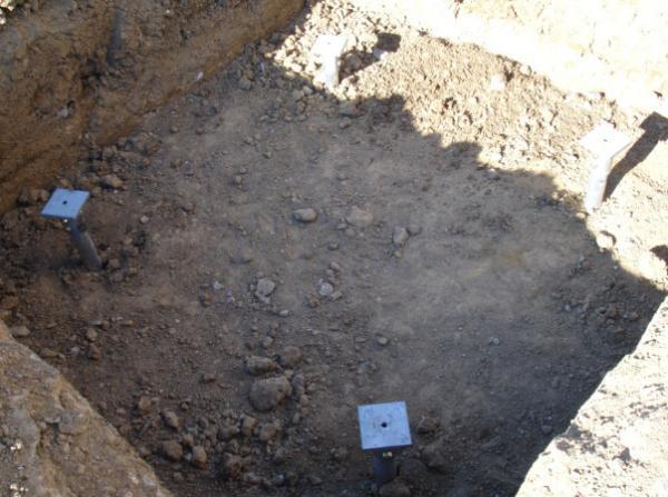 The design team recommended helical piles extending through the fill and weak native clays to bear within the deeper, dense alluvial sands. The two column foundations were each designed with four helical piles, each pile with a design working load of 20 kips. The helical pile configuration consisted of 2 7/8-inch OD by 0.276-inch wall hollow round shaft with an 8”-10” doublehelix lead section. Standard extensions were used to advance the piles to an average depth of 35 feet. Installation torques for the piles correlated to ultimate pile capacities of at least 40 kips (FOS ≥ 2). Helical piles were the ideal deep foundation alternative for this project. The total cost for the helical pile installation was less than the remobilization cost alone for the auger cast option. The helical piles were installed in one day.