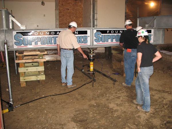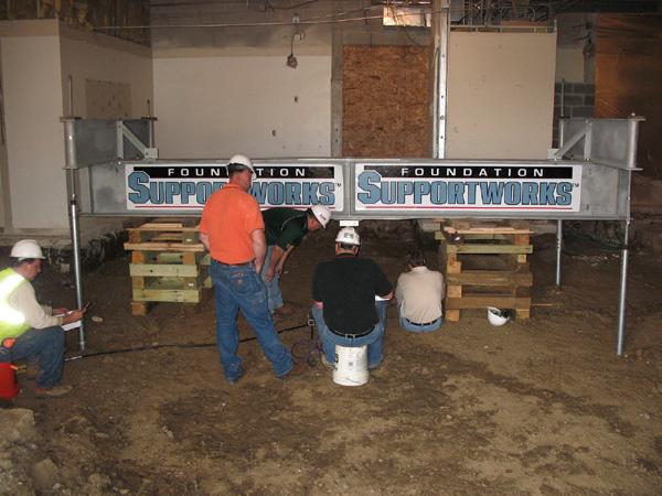 A helical pile configuration consisting of a 2-7/8 inch outside diameter round shaft with an 8”-10”-12” triple-helix lead section was selected. Extensions would advance the piles to minimum depths so the top helix blade was at least 15 feet below top of pile elevation. Helical piles were the ideal solution for this project because of limited access adjacent and within the existing building. Load tests were completed to verify performance (settlement) under load and confirm the initial calculated design capacities. Once the load tests were completed, sixty-six (66) helical piles were installed to support the new concrete masonry partition walls and a structural floor system. Ultimate capacities of the production piles, determined by correlation to installation torque, were at least twice the design load. The installation of 66 helical piles took less than four days to complete and the project continued to move forward on schedule.