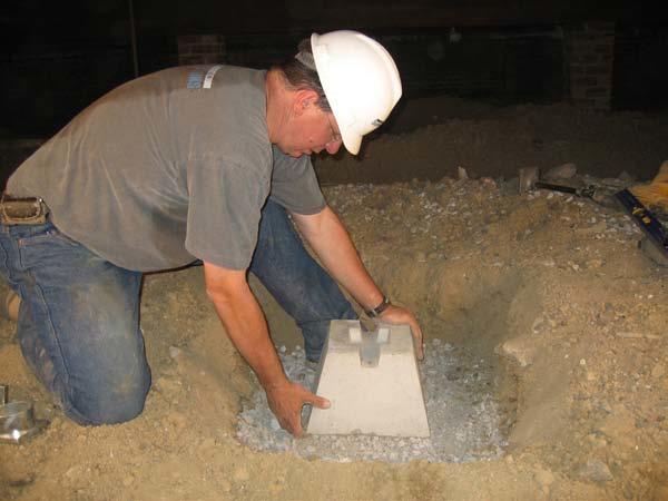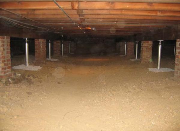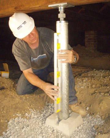 The General Contractor named Thrasher Basement Systems, Inc. (Thrasher) to discuss potential alternatives. Thrasher recommended the use of Foundation Supportworks’ SmartJacks™, a supplemental support system designed specifically for crawl space applications. Some of the SmartJack™ system design features include: two feet of compacted crushed stone base, a precast concrete footing, a 3 1/2 - inch diameter steel column, and an adjustable thread rod to set the height. All of the steel components are either hot-dip galvanized or zinc plated for corrosion protection. After reviewing the technical information, the architect approved the use of SmartJacks™ for the project. The SmartJack™ system does not require poured concrete footings, so there was no delay waiting for concrete to cure. Twenty-two (22) SmartJacks™ were installed within three days, which allowed the renovation project to remain on schedule.