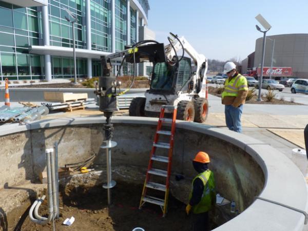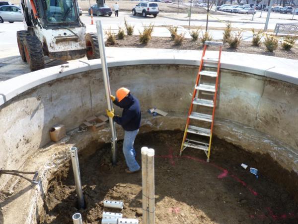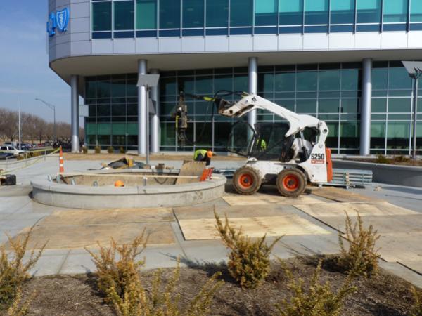 March 2011- A 40-foot tall metal sculpture was planned near the main entrance of a building on the new Blue Cross Blue Shield business campus. Design of the sculpture was finalized during the last phases of the campus construction. Pavements, sidewalks and landscaping were nearly complete. As the design of the sculpture was finalized, various foundation options were considered. Two test borings completed for the adjacent building encountered 48.5 to 53 feet of soft to medium stiff lean clay and fat clay over medium dense to very dense sand to depths of 95 feet and 111.6 feet. Layers of very stiff sandy lean clay (glacial till) were also sampled in one boring below a depth of 73.5 feet. With weak clay soils near the surface, differential settlement was a concern for a mat foundation. The structure would have to be supported on a deep foundation system to penetrate the weak clay soils and bear within the competent sands below. However, large pile installation equipment could not access the planned sculpture location without risk of damage to the existing pavements and sidewalks. Auger-cast piles, driven piles and drilled shafts would also be expensive options considering the mobilization costs and the limited number of piles required for the project.