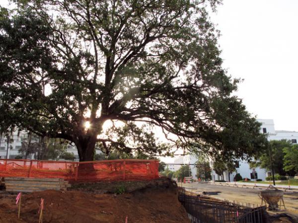 The Gaines Street reconstruction project included widening of the road to handle increased traffic volumes. However, the presence of a large oak tree northwest of the intersection of Gaines Street and Bronough Street complicated the proposed construction. The City planned to save the existing tree which was located only ten feet from the edge of the planned widening. Due to the proximity of the tree and its large root ball to the planned work, a typical cantilevered retaining wall design was not feasible. A sloped excavation or an excavation to install a segmental block retaining wall with geogrid reinforcement would also cut too far into the roots of the tree. Other design and construction considerations for the work area included overhead electric and cable lines and underground gas and water