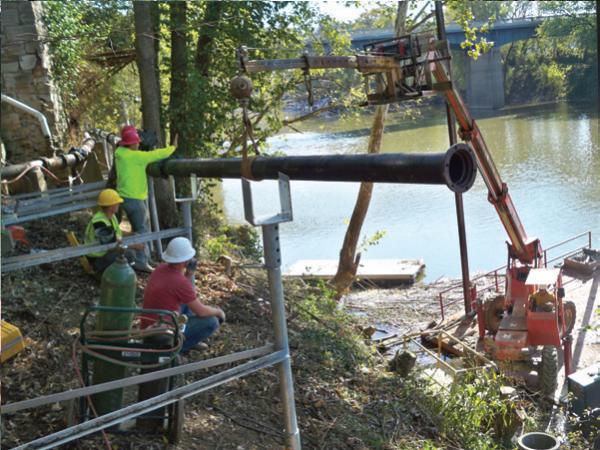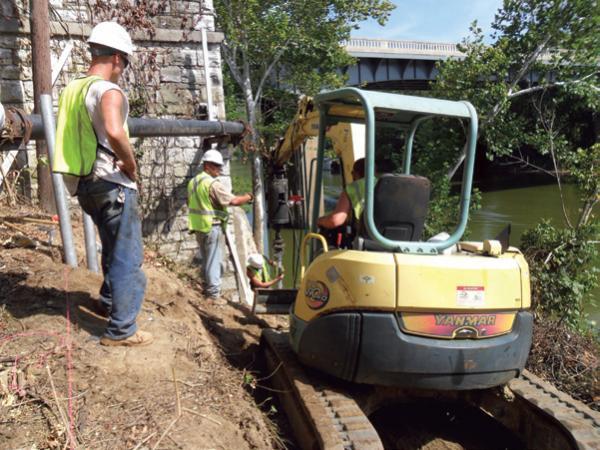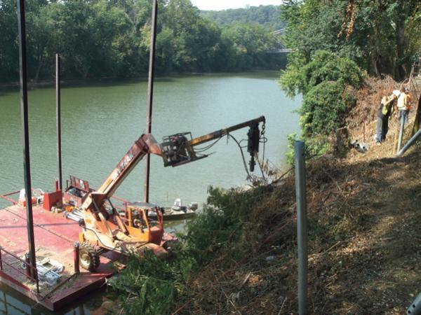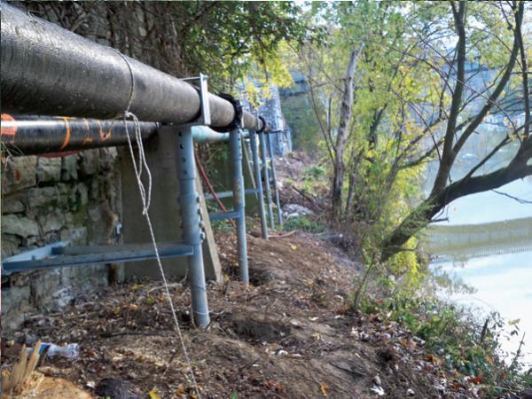 August 2011 - Rehabilitation of a sanitary sewer system was proposed in the state capital city of Frankfort, Kentucky. The project included the construction of approximately 500 feet of new sewer line adjacent to an existing, completely exposed/elevated sewer line. The planned height of the proposed sewer line ranged from approximately four to 17 feet above grade. The original line was supported on poured concrete columns formed against or next to stone retaining walls along the bank of the Kentucky River. The atypical nature of the project presented many specific challenges for implementing a solution to support the new sewer. The steep embankments and limited working space between the retaining walls and the river limited equipment access to most areas of the project. Geotechnical information was also limited as explorations could not be completed with standard machine-mounted equipment.