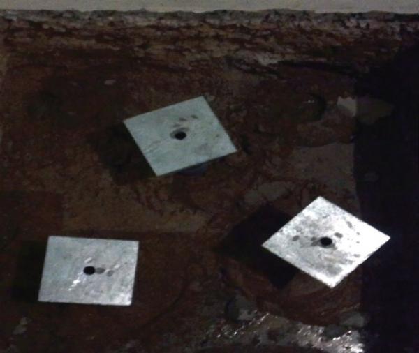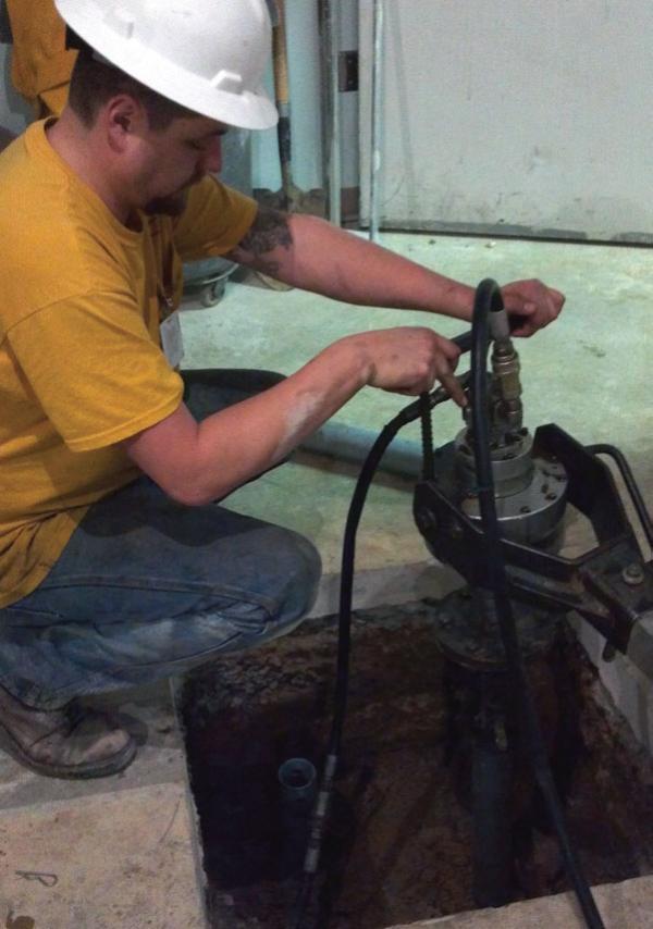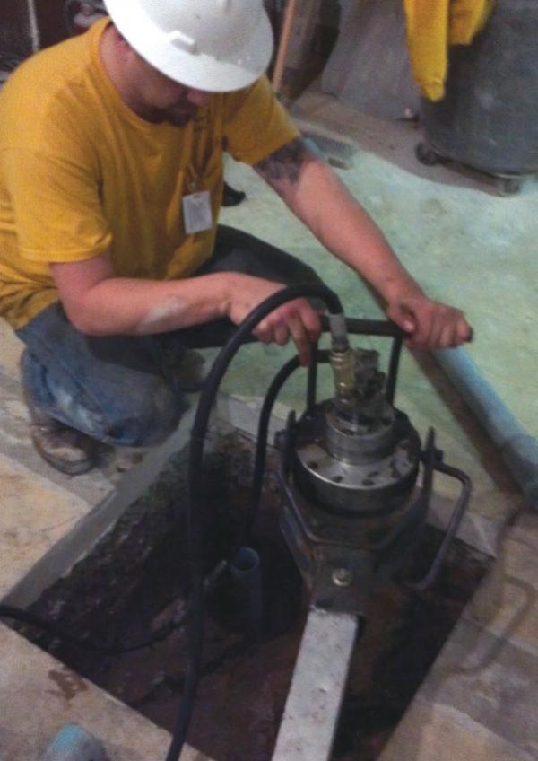 Helical piles were selected as the ideal deep foundation solution for this project. Each column would be supported by three helical piles cast into a three-foot square concrete pile cap. Nine (9) Model 287 (2.875-inch OD by 0.203-inch wall) hollow round shaft helical piles with an 8”-10” double-helix lead section were selected to support the design working load of 10 kips per pile. Handheld hydraulic equipment, with power source outside the building, was used to install the helical piles to at least 2,300 ft-lb of torque to correlate to ultimate pile capacities of at least 20 kips (FOS ≥ 2). The piles were installed to depths of 12 to 17 feet. The three piles within each cap were installed at a slight batter away from each other to allow the tops of the piles to fit within the pile cap and also allow adequate pile separation at the helix plate bearing depths. New construction brackets were bolted to the tops of the helical piles. The nine helical piles were installed in one day.
