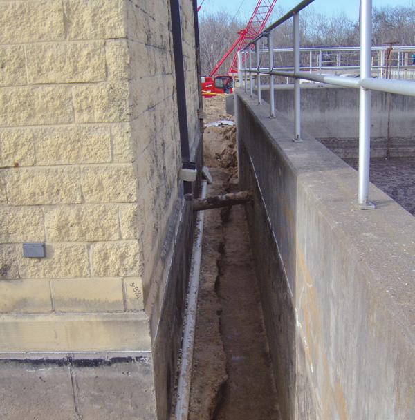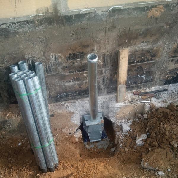 November 2011 - Renovations at the wastewater treatment facility included the construction of a new generator pad east of an existing blower building. The blower building had reportedly experienced settlement since it was constructed in 1984. Consulting engineers determined the blower building had settled down to the north on the order of five inches and the settlement was likely due to poor compaction of fill soils. It was also believed that further consolidation of the soils could occur due to water infiltration, vibrations from the new equipment, and/or additional loading of the soils from the new equipment. Recommendations to stabilize the blower building included the installation of retrofit helical piers spaced at six feet center to center for design working loads of 21 kips each. The blower building was to be stabilized only, and not lifted, to prevent additional cracking in the foundations and floor slab. Lifting of the structure could also result in separation or damage of the utilities. One of the unique challenges for this project included limited working space (three feet) between the blower building and a storage basin. The closest soil boring to the footprint of the blower building identified loess soil consisting of medium stiff to stiff lean clay and medium dense silt to a depth of 33.5 feet underlain by stiff to very stiff clay to the maximum depth explored of 43 feet.