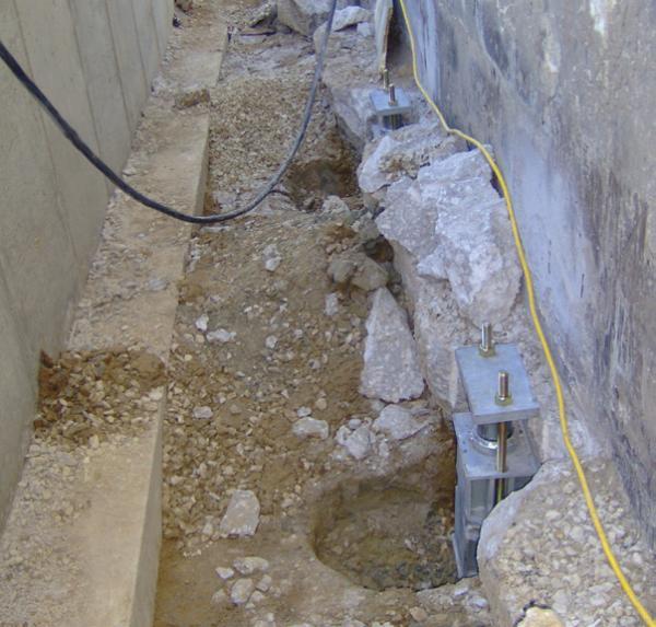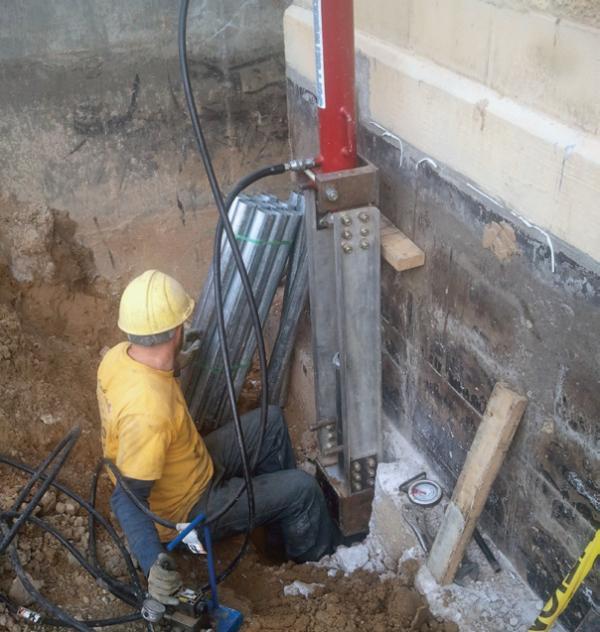 Both helical piers and push piers were considered for this project. Push piers were ultimately selected due to limited access for installation equipment, push piers being more economical since both systems would terminate at approximately the same depth, the difficulty of installing a helical pier lead section with three or more helix plates in a retrofit application, and the verification of each pier’s ultimate capacity as determined through the installation process. The stabilization plan included sixteen (16) Model 288 (2.875-inch O.D. by 0.165-inch wall) hydraulically driven push piers spaced at six feet on center with design working loads of 21 kips each. The footing was notched for the placement of the underpinning bracket assemblies by removing small sections of concrete back to the face of the foundation wall. The sixteen piers were advanced to driving forces of at least 1.83 times the design working loads to an average depth of 40 feet below the bottom of the footing. After the piers were driven individually, hydraulic cylinders were attached to each pier, connected in series, and uniformly loaded to the design working load of 21 kips. Despite tight working conditions and utility obstacles, the building was successfully stabilized and the project was completed on time.