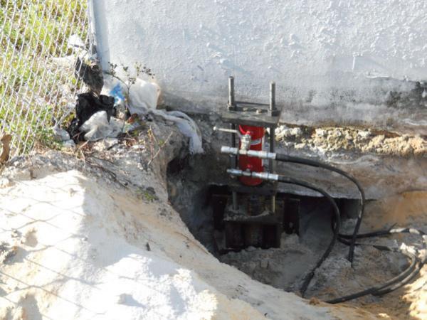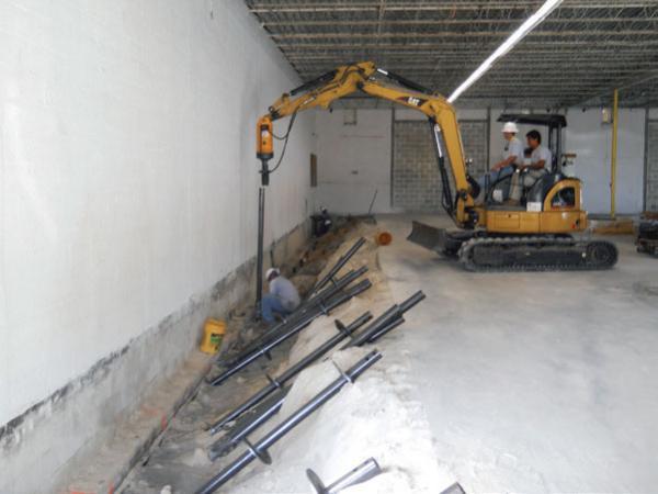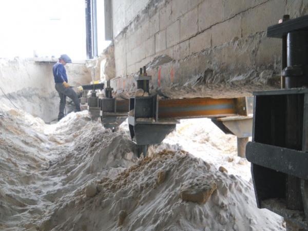 Summer 2012 - An environmental study discovered contaminated soils to depths of 20 feet and extending beneath one end of an existing warehouse. The 10,000 square-foot warehouse, constructed in 1968, is typical high bay warehouse construction with perimeter strip footings 30 inches wide by 12 inches thick, 18 feet high masonry block walls, and bar joists supporting a flat roof. In order to remove the contaminated soil, the entire length of one of the exterior walls would have to be supported with a deep foundation that extended below the proposed excavation depths. Test borings identified a general subsurface profile consisting of loose to medium dense fine sand from the surface to a depth of about 38 feet, over medium dense to dense sand from 38 feet to the completed depths of the borings at 50 feet. Groundwater was encountered at a depth of 16 feet.