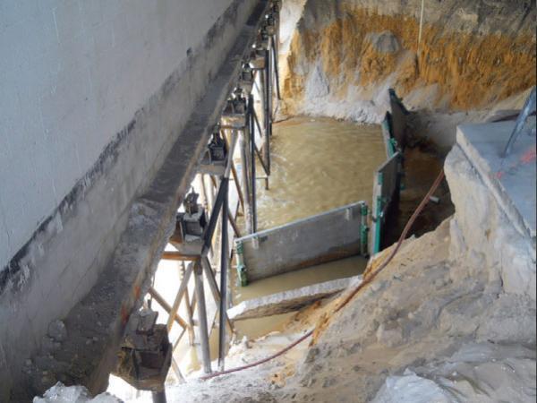 Several deep foundation options were considered, but helical piers appeared to be the most feasible and economical. Helical piers can be installed within sand and below groundwater without the need for casing, they can be installed with smaller equipment inside the building, and the installation does not generate spoils that would have to be contained for proper treatment and/or disposal. The foundation support detail included 34 Model 350 (3.5-inch OD by 0.313-inch wall) retrofit helical piers with 10”-12”-14” triple-helix lead sections. The piers were designed and installed in order to support the design working load of 12 kips even after removal of the 20 feet of overburden soils. The piers were installed in a vertical orientation and to depths up to 45 feet. The piers were installed in 17 pairs across the inside and outside edges of the wall footing to allow steel beams to be placed on and welded to the retrofit brackets, spanning the footing width. Hydraulic cylinders were used to uniformly preload the piers prior to excavation. As the excavations were made, steel cross-bracing was fieldwelded to the piers to minimize unsupported lengths and prevent buckling. The pier installation, with welding of the cross-bracing, was coordinated with the excavation to remove the contaminated soil and completed within four days.