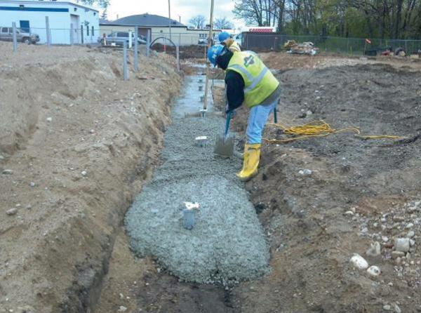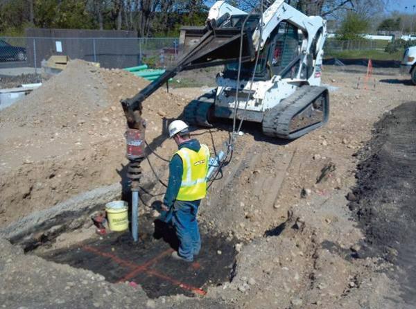 A new Citizens First Credit Union was to be constructed across two previously developed properties with existing structures. The existing structures would be demolished and completely removed to allow for the construction of the new slab-on-grade singlestory building, canopy-covered drive-thru lanes and parking areas. A geotechnical investigation included the advancement of four soil borings within the proposed building footprint. The borings identified five to 7.5 feet of very loose to loose uncontrolled fill over stiff to very stiff residual clays. The original geotechnical recommendation for foundation support included over-excavation of the existing fill soils and replacement with compacted and tested engineered fill. However, an excavation made north of the proposed building to remove underground storage tanks raised concern that contaminated soils could exist within the limits of the proposed over-excavation. Excavation and either treatment or disposal of contaminated soils would add significant costs to the project. Helical piles were then considered as an attractive deep foundation option since they do not generate spoils during installation.