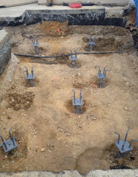 Helical piles were considered as an ideal deep foundation system for the project. Helical piles do not generate spoils during installation so any contaminated soils would remain in the ground and high treatment and disposal costs of contaminated material (due to pile installation) would be avoided. Helical piles can also be installed with smaller equipment within limited access areas and the installation generates little to no vibration. The original pile cap design included six helical piles to support design working loads per pile of 55 kips in compression and 46 kips in tension. The pile configuration consisted of the Model 350 (3.5-inch OD by 0.313-inch wall) hollow round shaft with a 10”-12”-14” triple-helix lead section and a single 14” helix plate on the first extension. A calibrated electronic torque transducer was utilized for direct measurement of pile installation torque. The piles were installed to torque-correlated ultimate capacities exceeding the design working loads by a factor of safety of at least two. Pile installation depths varied widely from about 22 to 45 feet below the bottom of pile cap elevation (average of 33 feet). Two of the piles refused abruptly within the dense bearing soils, raising some concern about whether the tension capacity was achieved. With the tight construction schedule, the design team decided to install two additional piles in lieu of performing pile load tests. New construction brackets were bolted to the tops of the pile shafts and cast into the concrete foundation.