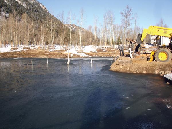 A new boat dock was planned along the shoreline of a small manmade lake that formed within the limits of an abandoned gravel pit. The proposed dock would extend out into the lake from a stone paver terrace surrounded on three sides by poured concrete retaining walls and stepped walkways. The dock would be eight feet wide and 32 feet long and extend into water as deep as 12 feet. Helical piles were selected to support the dock by advancing through the soft and loose soils at the lake bottom to deeper, more competent materials below. Specific challenges of the project included accurate layout and installation of the piles, reaching out with the drive head to the proposed pile locations, and providing a stable working platform for the installation crew.
