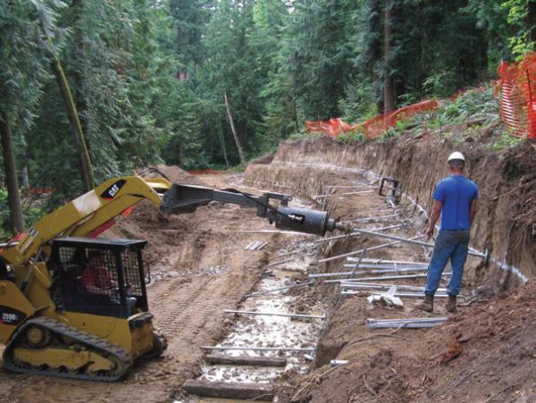 A new 250-foot long gabion basket retaining wall was proposed along a wooded hillside. The retaining wall would support excavations made into the slope for the purposes of constructing and then maintaining a walking trail below. The tallest section of wall would consist of two tiers of stacked gabion baskets with each tier of three baskets being five feet high above grade (one foot buried). The proposed gabion baskets were three feet wide and either 1.5 feet or three feet tall, filled with six to ten-inch crushed stone. The preconstruction hillside conditions disallowed access to the project site with traditional track or truck-mounted drill rigs. Hand auger borings completed to depths of about nine feet at the base of the wall and within the proposed retained soils encountered medium stiff to very stiff clayey silt. With the sloped hillside conditions and the soils encountered, the taller sections of wall would require tiebacks or anchors to provide lateral stability.