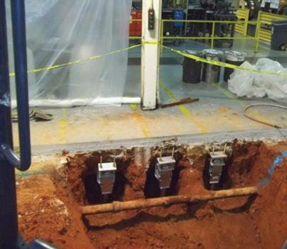 Six (6) Model 288 (2.875-inch OD by 0.276-inch wall) round shaft helical piers with an 8”- 10” double-helix lead section were installed to support the existing column footings. The retrofit piers, three per column location, were advanced to approximate depths of 21 feet below the existing slab and to torque-correlated ultimate capacities of at least twice the design working load of 15 kips (FOS ≥ 2). The piers were then fitted with standard retrofit brackets with a 30-inch external sleeve. The machine press foundations included thirty-two (32) Model 288 helical piles with a 10”-12” double-helix lead section to support a design working compression load 32 kips. The helical piles were advanced to depths of approximately 14.5 feet below the bottom of the excavation to achieve a torque correlated ultimate capacity of at least twice the design working load (FOS ≥ 2). Sixteen (16) helical tiebacks with a 12” single-helix lead section were installed along the pit walls to support a design working tension load of 12.5 kips. The eight tiebacks installed in the pit for the new press consisted of Model 150 (1.5-inch round-corner square bar) shafts, while the eight tiebacks installed in the second pit consisted of Model 287 (2.875-inch OD by 0.203-inch wall) round shaft material. The tiebacks were advanced approximately 3.5 feet above the bottoms of the excavations and at a downward angle of 30 degrees from horizontal. The tiebacks were installed to lengths on the order of 21 feet and to torque correlated ultimate capacities of at least twice the specified design working load.