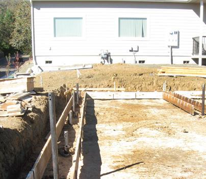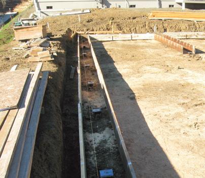 Helical piles were selected over other deep foundation alternatives. Helical piles could be installed with smaller equipment within the tight-access conditions of the partially developed property. A mini-excavator could also install the piles safely at the top of the steep slope. Consideration was given to deep trench excavations for the footings, but it was believed that this option could potentially cause an unstable slope condition. Fifteen (15) new construction Model 288 (2.875-inch OD by 0.276-inch wall) hollow round shaft helical piles with 10”-12” double-helix lead sections were installed to support design working compression loads of 20 kips (interior support) and 35 kips (exterior wall). The piles along the west exterior wall were spaced at eight feet on center and were advanced to depths ranging from eight to 14 feet below grade. Pile depths generally increased from north to south. The piles along the westernmost north-south interior support were spaced at ten feet on center and were advanced to depths ranging from five to 11 feet. Pile depths again increased from north to south. The ultimate pile capacities determined by correlation to installation torque were at least twice the required design loads (FOS ≥ 2). The helical piles were cut to design elevation and new construction brackets were placed at the tops of the piles to be cast into the concrete grade beams. The pile installation was completed in just one day.
