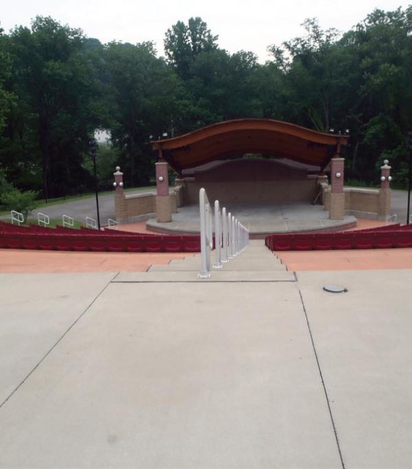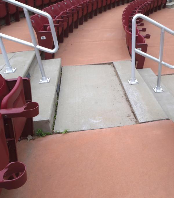 The Parks Board of Clarksburg, West Virginia commissioned the repair of concrete landings at “The Amp”, the community’s 2,000 seat amphitheater. Three feet by six feet poured concrete landings are located at the seating elevations along each of the three access stairways. Twenty-three of these landings had settled as much as three inches, creating trip hazards that increased risk of potential injury to patrons and the City’s exposure to claims. The Parks Board specified that the concrete be lifted back toward level, voids be filled beneath the slabs, and the entire project be completed in less than two weeks to ensure the amphitheater was ready for the thousands of guests attending the Fourth of July concert. Removal and replacement of the slabs was considered, but ultimately dismissed due to the limited time available and the idea that there would then be different colors of concrete along the stairs.
