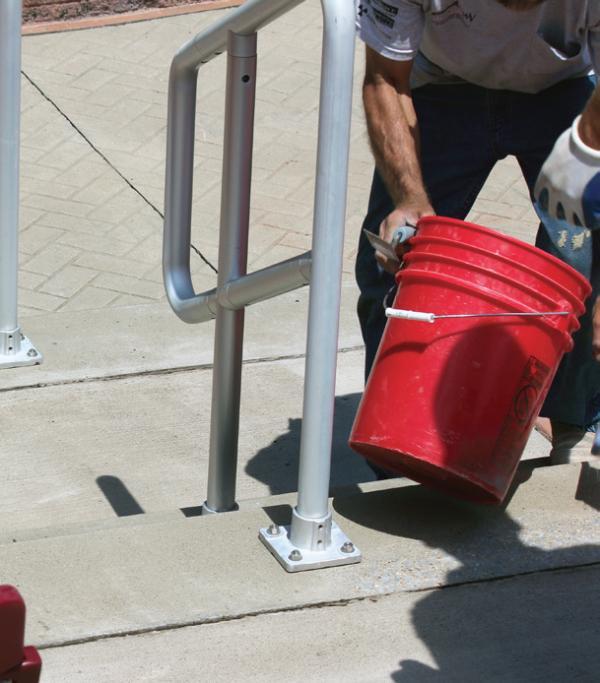 The Parks Board selected PolyLEVEL™ polyurethane injection to fill the voids and lift the landings back toward their original elevations. PolyLEVEL™ is a two-part urethane that expands into a rigid foam used to fill voids, stabilize slabs and lift concrete. Once injected through small 5/8-inch drilled “ports” in a slab or surface, a chemical reaction converts the liquid urethane components to a strong, rapidly-setting foam material. In its foam state, PolyLEVEL™ is relatively light, weighing two to six pounds per cubicfoot (pcf). Other void-filling or lifting materials can weigh upwards of 120 pcf, adding significant weight to supporting soils or base materials and potentially contributing to further settlement. With a typical in-place compressive strength of at least 75 pounds per square inch (psi), PolyLEVEL™ 250 was proposed to support the landings. Foundation Supportworks® of West Virginia prepared the work area by first cutting through joints with a concrete saw to eliminate friction and prevent binding between the slabs and adjacent steps. A total of 150 pounds of PolyLEVEL™ 250 was injected through 65 ports. The expanding PolyLEVEL™ foam filled the voids and lifted the 23 concrete landings back toward level to minimize or eliminate trip hazards. The entire project was completed in less than four hours.
