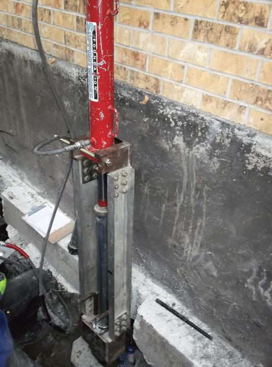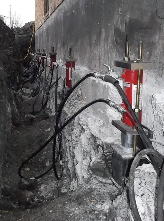 Thirty-two (32) Model 288 (2.875-inch O.D. by 0.165-inch wall) hydraulically driven push piers were proposed at a six-foot maximum spacing to underpin the south wall and the southeast and southwest corners of the building. A continuous trench excavation was made outside the building to expose the footing. The footing was notched back to the face of the foundation wall at each pier location to install retrofit foundation bracket assemblies. The push piers were advanced to depths of 70 to 88 feet below bottom of footing elevation to bear on competent material. The piers were driven to hydraulic fluid pressures averaging 4,000 psi, corresponding to 38.5 kips of drive force. Hydraulic cylinders were used to stabilize and then uniformly lift the wall approximately ¾-inch back toward its original elevation. The excavation, footing preparation, pier installation and site clean-up was completed in five days.