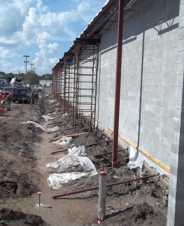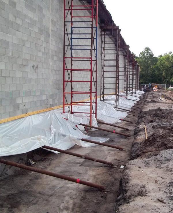 A long strip footing was constructed on an adjacent lot approximately six feet away from the west exterior wall of the Academy Sports and Outdoors building (four feet clear between edges of concrete footings). This construction reportedly caused the entire length of the wall to uniformly settle approximately one-half inch. The relatively sudden movement caused damage to the exterior block wall, interior flooring and drywall, and led to the closing of the store until the west wall of the building could be permanently stabilized. Temporary measures to prevent wall failure and further damage to the store included lateral support with steel tube bracing and vertical support to the overhanging roof with scaffolding. The geotechnical investigation completed for the proposed adjacent structure identified competent bearing material (medium dense to dense sand) from just a few feet below the surface to the explored depth of 20 feet below grade. Dense sand was encountered below a depth of about 6 to 10 feet at each boring location. A relatively high water table at three to four feet below grade, as is typical for the area, was also observed.