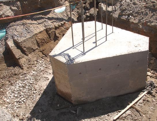 The deep foundation system included thirty-one (31) Model 450 (4.5-inch OD by 0.337- inch wall) round shaft helical piles with a 10”-12”-14” triple-helix lead section. All helix plates were ½-inch thick with a V-style leading edge to allow for better penetration into the deep bearing soils. An embedment length within the competent bearing material was specified in order to achieve both the required tension and compression capacities. Piles would be advanced to the specified embedment length and to torquecorrelated ultimate capacities of at least twice the design working loads (FOS ≥ 2). To verify that the piles could achieve the required torque and embedment, two test piles were advanced within the footprint of the proposed structure. A calibrated electronic torque transducer was utilized to monitor pile installation torque directly. The test piles were removed after the depth and torque were achieved and confirmed. A 45,000 ft-lb hydraulic drive head and a John Deere 200D track excavator were used to provide sufficient torque and crowd during installation. Standard ten foot extensions were used to advance the piles to the necessary depths. The tops of the piles were fitted with custom brackets. Various combinations of battered and vertical piles were used at the pile cap locations. To maintain a continuous supply of material during installation, a two-man crew was assigned specifically to deliver product from the staging area to the project site. Installation of the helical piles, including the test piles, was completed in just four days.