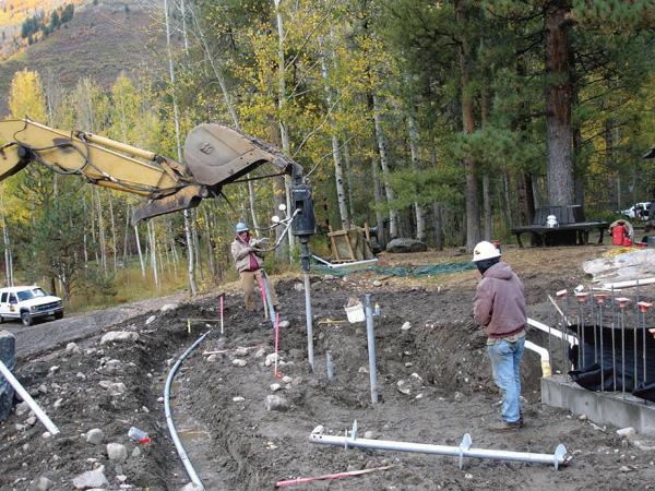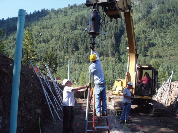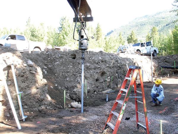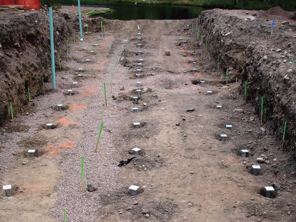 A Caterpillar 312 track excavator was fitted with a custom mounting bracket to support the drive head with a rated output torque of 12,000 ft-lb. Cobbles and boulders were encountered during the helical pile installation, hindering pile advancement and affecting location accuracy. Piles were removed and relocated where they could not pass obstructions and reach the minimum specified depth. Seven additional Model 288 and seven additional Model 349 helical piles were required where pile relocation distances were beyond structurally-tolerable limits. The piles were advanced to depths ranging from 15 to 27 feet to achieve torque-correlated ultimate capacities of at least twice the design working loads (FOS ≥ 2). The tops of the piles were cut to design elevation and fitted with new construction brackets to be cast into the poured concrete slabs. The 69 helical piles were installed in six days.