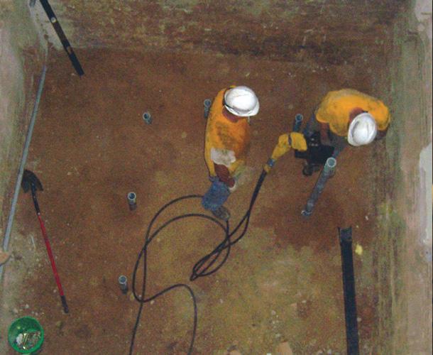 Helical piles were selected as the ideal deep foundation solution for this project given their ability to be installed with relatively small equipment within the confined space of the existing building. Twelve (12) Model 287 (2.875-inch OD by 0.203-inch wall) hollow round shaft helical piles with a 10”-12”-14” triple-helix lead section were selected to support the design working load of 25 kips per pile. A hand held drive unit, powered by a remote hydraulic source, was used to install the helical piles to at least 5,600 ft-lb of torque to correlate to ultimate pile capacities of at least 50 kips (FOS ≥ 2). Standard extensions advanced the piles to depths from 14 to 20 feet below the bottom of the excavation. New construction brackets were bolted to the tops of the helical piles to be cast into the poured mat foundation of the elevator shaft. The twelve helical piles were installed in one day.