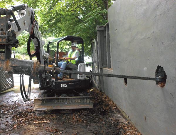 The wall stabilization detail included nine (9) Model 150 (1.5-inch round corner square bar) helical tiebacks. A mini-excavator could maneuver within the sidewalls of the enclosure to install the tiebacks away from the trash compactor. Hand held equipment would then be used to install tiebacks around the compactor and beneath the catchment bin. An 8”-10” double-helix lead section was selected to minimize the size of penetrations through the walls and to support the design working tension load of 8 kips. The tiebacks were installed in a single row approximately six feet from the tops of the walls and at a center-to-center spacing of approximately four feet. The tiebacks were installed at downward angles of 10 and 15 degrees from horizontal. Standard extensions advanced the tiebacks to lengths from 12 to 55 feet to achieve torque-correlated ultimate capacities exceeding the design working load by factors of safety greater than three (FOS > 3). Typical factors of safety for tension applications range from 2.0 to 2.5; however, a higher than typical factor of safety was specified by the engineer due to installing into unknown soil conditions. Thread rod adaptors transitioned the tiebacks to high strength thread rods for connection to a waler system of two-inch by four-inch tube steel. The holes in the walls were patched before installing the tube steel walers. PVC sleeves were included around the thread rod to allow pretensioning of the tiebacks. The tieback installation was completed in just two days.