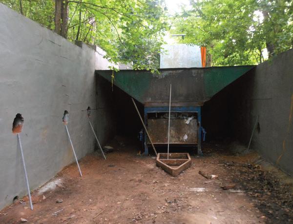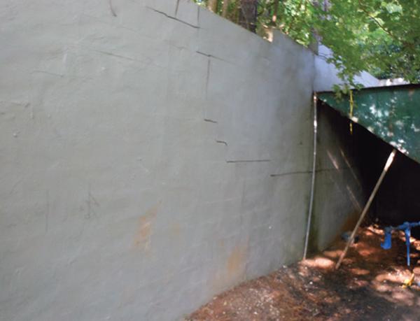 The narrow enclosure and the immovable trash compactor limited equipment access to install the tiebacks. The trees and other vegetation above the walls created other concerns about installing tiebacks through potentially obstructing root systems. A soil investigation behind the retaining walls was not performed.