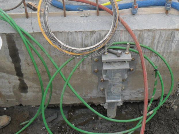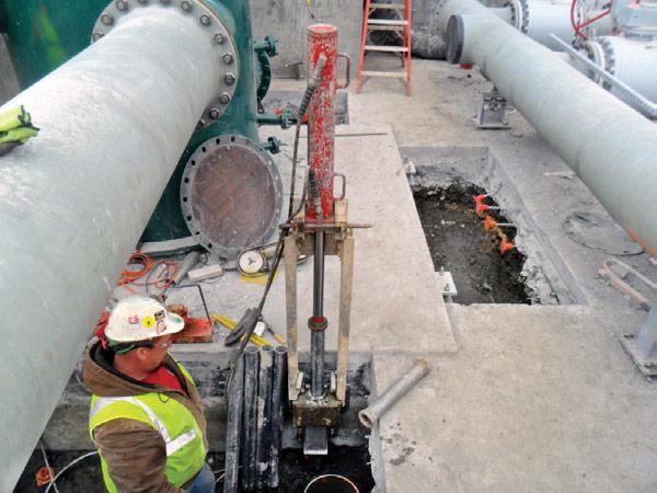 The foundation support detail included eight hydraulically-driven push piers at each mat foundation, two at each corner, to support a design working compression load of 15 kips per pier. Flush mount brackets were anchored to the sides of the concrete foundations with adhesive anchors to avoid excavation below the pads at the pier locations. The 16 Model 288 (2.875-inch OD by 0.165-inch wall) push piers were then driven from 22.5 to 37.5 feet below the bottoms of the foundations to achieve the target drive pressure of 4,000 psi (drive load of 38.5 kips). For added system rigidity, the pier tubes were filled with 5,000 psi bag mix concrete every six feet during the pier installation. Pad B was stabilized by reloading the piers to the design working load of 15 kips. Pad A was lifted 1 inch to 3.5 inches to achieve both proper elevations for surface drainage and equipment/piping alignment. The lifting operation was monitored and directed by a survey crew. The piers supporting Pad A were locked off at loads between 15 and 20 kips. The void created beneath Pad A was filled with PolyLEVEL® PL250, a two-part, rapidly setting polyurethane foam. The material was injected from the top of the concrete through eight PVC-sleeved ports to provide uniform coverage.