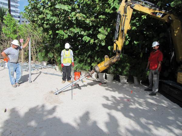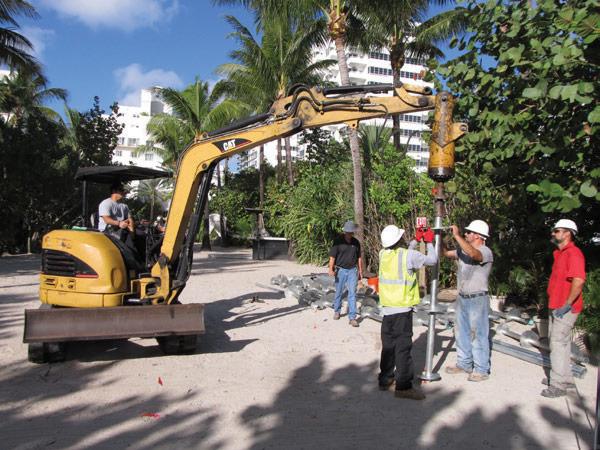 A designer beach house conceptualized in 1934 by French architect, Charlotte Perriand, was planned for construction and temporary display outside the prestigious Raleigh Hotel for the 2013 Design Miami Fair. The structure was commissioned by the French luxury group, Louis Vuitton, to be prefabricated in Italy and shipped to Miami for assembly. The beach house would then be disassembled and removed immediately following the fair to allow for an outdoor wedding planned at the hotel. A geotechnical investigation was not performed; however, loose surficial sands over medium dense sands were expected at the site. A deep foundation system was therefore required, which could be easily installed to support the temporary structure, and just as easily extracted after the fair.