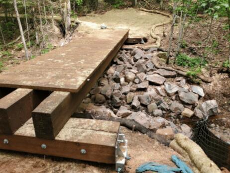 Located in the Wisconsin Northwoods, the Chequamegon-Nicolet National Forest covers more than 1.5 million acres of forest preserve across five counties. Severe storms and runoff damaged walking trails within two of the counties. This damage also included the total destruction of three pedestrian bridges located at stream crossings. It was anticipated that future storm events of similar or greater magnitude would occur more frequently, with higher levels of flooding. Therefore, the designs for the replacement bridges would need to consider the increased flood potential, with anticipated scour depths of 3 to 6 feet below the new abutments. The bridges were located in extremely remote areas, being several hundred yards to over a mile from any access roads, which restricted the use of concrete abutments. The construction for the new bridges would also require smaller equipment to limit disturbance to the protected forest and streams. Geotechnical investigations at the new bridge locations generally showed very loose sand to depths of about 2.5 to 5 feet with shallow refusal at some of the abutment locations and cobble formations at others. Given the potential for future flooding, the abutments would need to resist uplift and lateral loads in addition to supporting vertical compression loads.