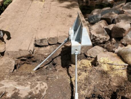 Helical piles and anchors were chosen as the most economical solution for supporting the bridge abutments given the unique challenges and environmental constraints. The final foundation design included two vertical helical piles and four helical anchors (installed at a 45-degree batter) for each abutment. The abutments and bridge superstructure would be constructed with timber and a custom timber bracket was designed to connect the helical piles and anchors to the timber abutments. The custom bracket incorporated the vertical piles and battered anchors into the same bracket.