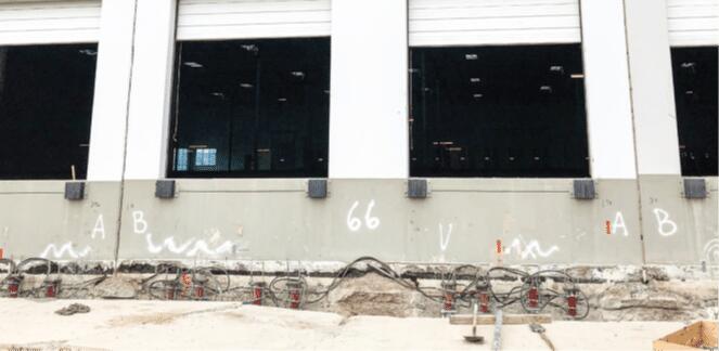 A 279,000 square-foot industrial building, constructed in 2013, exhibited significant wall and floor slab settlement, with more than 12 inches of movement at the southeast corner. Before the building was constructed, the site was initially used for mining sand and gravel. It was later used as an inert debris landfill for about 13 years. Records from the landfill operations indicated that the fill was composed primarily of soil, rocks, gravel, concrete and asphalt debris. A geotechnical investigation performed in 2007 identified about 50 feet of debris fill east of the subject property. Based on the recommendations in the report, deep dynamic compaction was selected for soil improvement before construction, to allow the use of a shallow foundation system. After the settlement had occurred, another geotechnical investigation performed in 2018 showed about 60 feet of debris fill at the southeast corner of the existing structure. The building construction consisted of exterior concrete tilt-up panels and interior steel columns, both supported on shallow foundations. As a result of the settlement, the tops of adjacent tilt-up panels separated by as much as 8 inches, and their connections to the roof joists were compromised. A temporary shoring system was then required to support the walls and roof, in case of further misalignment. Given the amount of settlement and misalignment of the tilt-up panels, the ideal remedial method would first stabilize the structure and then potentially lift the walls back toward the original elevation. The interior column pads and floor slab in the southeast corner of the building would also require stabilization and minor lifting. Underpinning was required beneath 43 of the wall panels, with each panel being 26 to 41 feet long. Estimated service loads of the panels ranged from 7 to 14 kips per lineal foot.