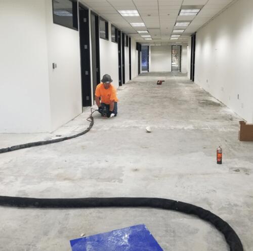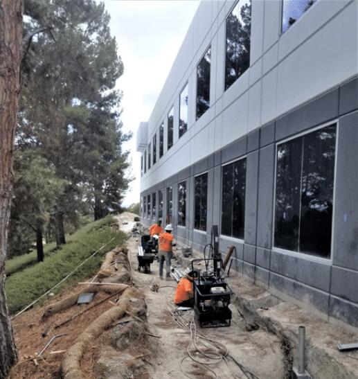 An approximate 38,000 square-foot, two-story office building, constructed in 1991, exhibited significant wall and floor slab movement by 2016. A manometer survey performed in 2016 indicated about 4-½ inches of differential settlement at the south and southeast section of the building and up to 1-¼ inch cracks along the south and southeast wall and ceiling areas. The building construction consisted of exterior concrete tilt-up panels and interior steel columns, both supported on shallow foundations. Glass wall panels were also located along the exterior walls with some of the panels requiring replacement due to glass damage from the wall movement. Four soil borings, advanced around the perimeter of the building in 2016, showed about 30 feet of fill had been placed at the south and southeast area of the site prior to construction of the building. Another manometer survey performed in 2018 showed an additional ½-inch of differential settlement had occurred over the two-year period, suggesting that the building was continuing to settle. Based on the manometer surveys and the geotechnical borings, the source of the settlement was determined to be from foundation movement at the south and southeast exterior walls due to the deep fill at this area of the site. Given the amount of settlement and misalignment of the tilt-up panels, the ideal remedial method would first stabilize the structure and then potentially lift the walls back toward the original elevation. After the lift operations, void space created under the interior floor slab and wall footings would require filling. The site grade near the south and southeast exterior walls generally consisted of about 10 feet of level ground until an approximate 2:1 (horizontal to vertical) slope extended downward for about 60 to 70 feet. With the site grading conditions, construction equipment access was limited at the wall areas requiring underpinning.