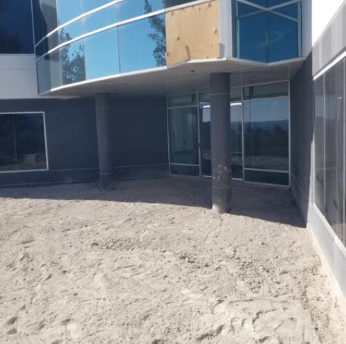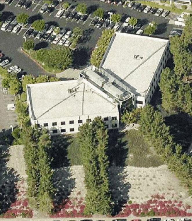 Arial view of the office building showing the slope behind the center patio and south and southeast wall areas
