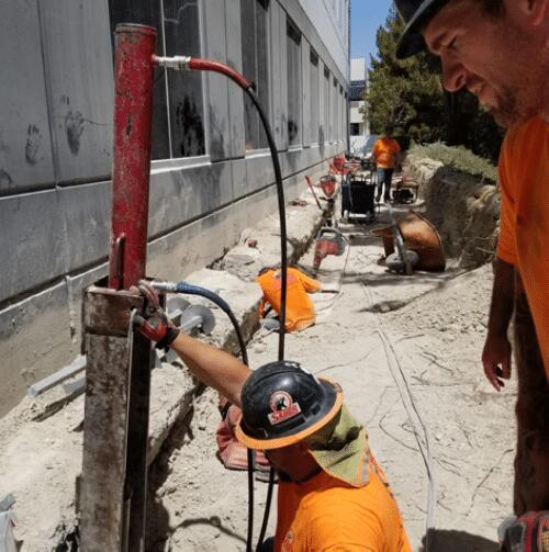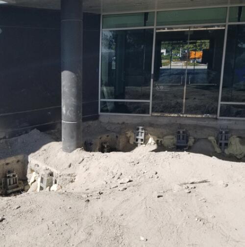 Given the access limitations and other project challenges, a combination of push piers and helical anchors were selected as the optimal solution for underpinning, lifting, and lateral support of the tilt-up panel footings. The south and southeast exterior walls and a center patio area would require underpinning along a length of about 350 feet. The Model 350 (3.5-inch OD by 0.165-inch wall) push pier system with side-load retrofit brackets was ultimately selected to support and lift the tilt-up panel foundations. The service compression loads were estimated at 6.3 kips per linear foot which would require 58 push piers on approximate 6-foot centers. The lateral support for the footings during the underpinning and lifting operations would be accomplished using Model HA150 (1.5-inch, solid-square shaft) helical anchors with an 8”-10” helix configuration incorporated into the Model 350 side-load brackets at every other pier location. The helical anchors were installed at an approximate 20-degree batter (from horizontal) and were terminated when a torque correlated capacity of at least 12.1 kips was achieved. The installed anchor lengths varied from 10 to 38 feet in order to achieve the required capacity. The push piers had a 31-foot minimum depth requirement (to bear below the estimated fill depth), and a minimum final drive force of 56.7 kips was specified to achieve a minimum factor of safety of 1.5. The actual installed push pier depths varied from 34 to 73 feet to meet the required capacity. The lift operations recovered about 1 ¾ inch of the initial settlement. Following the push pier lift and lock-off operations, the void space created under the footings and interior floor slab was filled with 2,900 pounds of PolyLevel® PL400. PolyLevel® PL400 is a two-part liquid urethane that is mixed and injected through 3/8-inch holes drilled through the slab to expand into a rigid foam and serve as a very light, high strength void space material. PL400 has an installed density of 4 to 6 pcf with a compressive strength of 70 to 80 psi. The underpinning, anchor installation, lifting and void filling was performed during 40 working days.