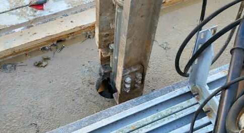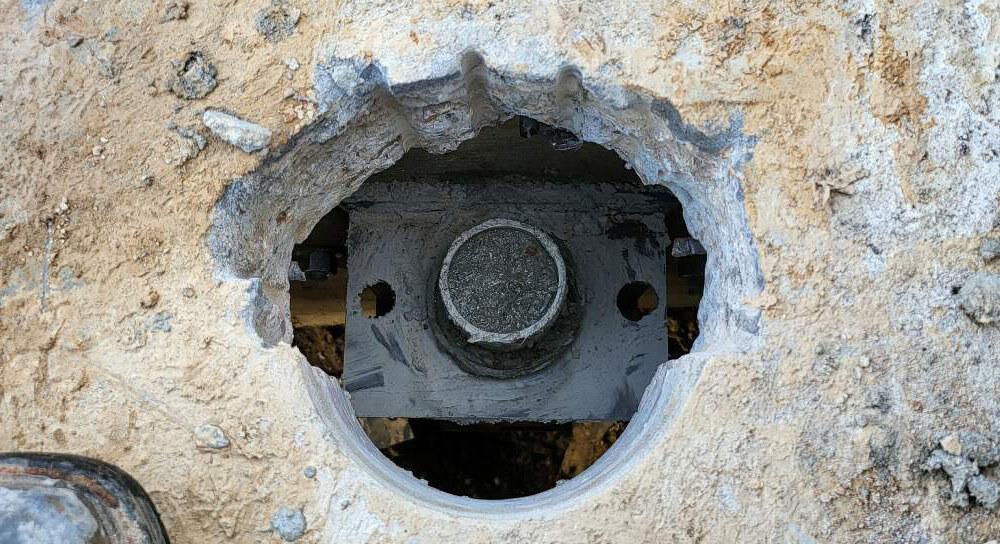 Given the access limitations, lack of soil information and other project challenges, the Model 288 (2.875-inch OD by 0.165-inch wall) push pier system was selected as the optimal solution for underpinning at the bleacher location. Flushmount brackets were utilized to connect to the structure since they could be mounted to the vertical face of the support beams and installed in the low overhead area. The overhead clearance was so tight between the top of the brackets and the bottom of concrete slab, access holes were cored in the slab above each bracket location to facilitate set up of the drive stand and driving the pier tubes. The design required 17 push pier locations with service compression loads of 10 kips. A safety factor of two was specified for an ultimate capacity of 20 kips at each pier location. The piers were installed to a final drive force of 20 kips and the load was maintained for 10 minutes to verify capacity and monitor creep movement. The push piers were installed to average lengths of 32 feet. The underpinning was completed in 3 days.