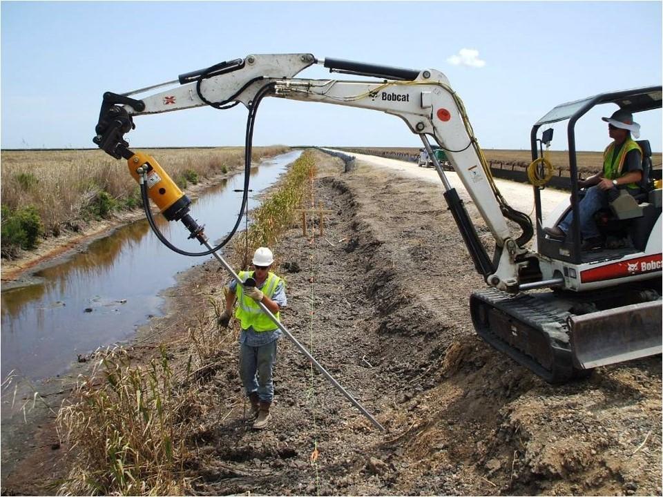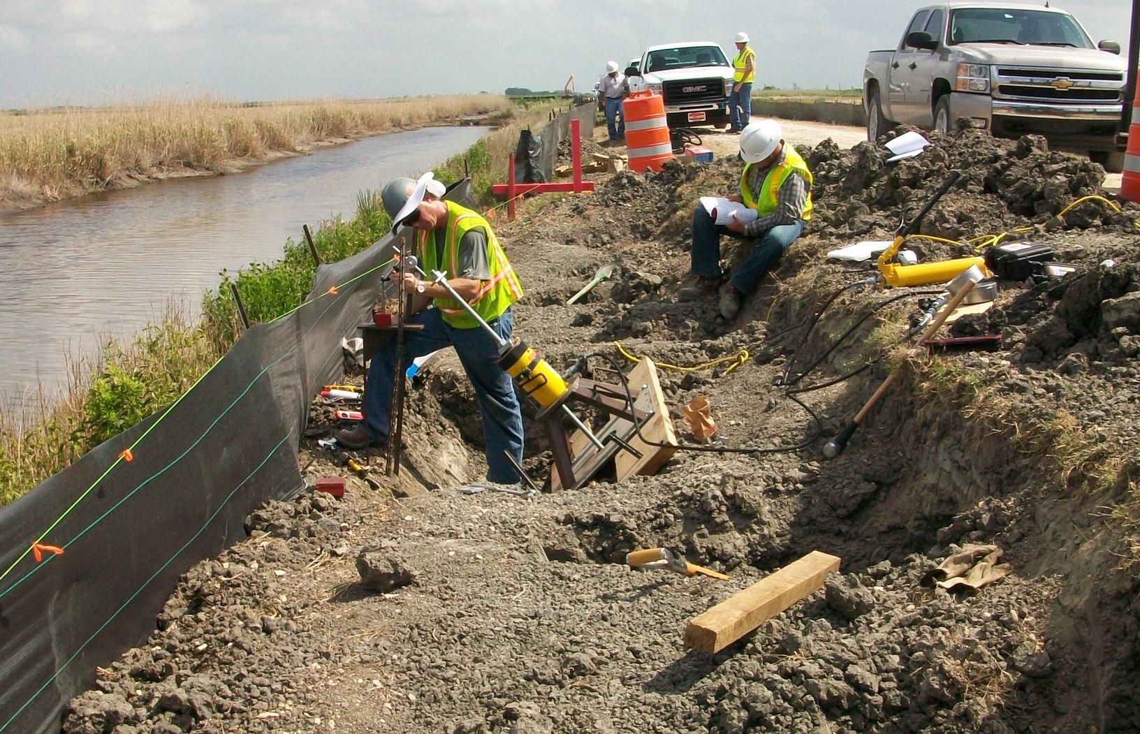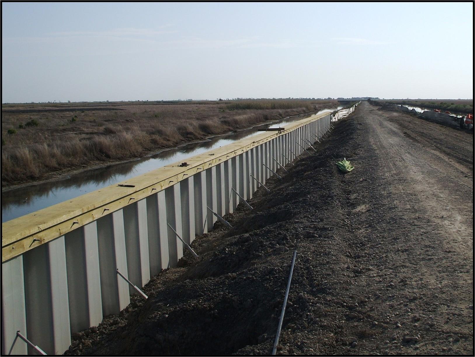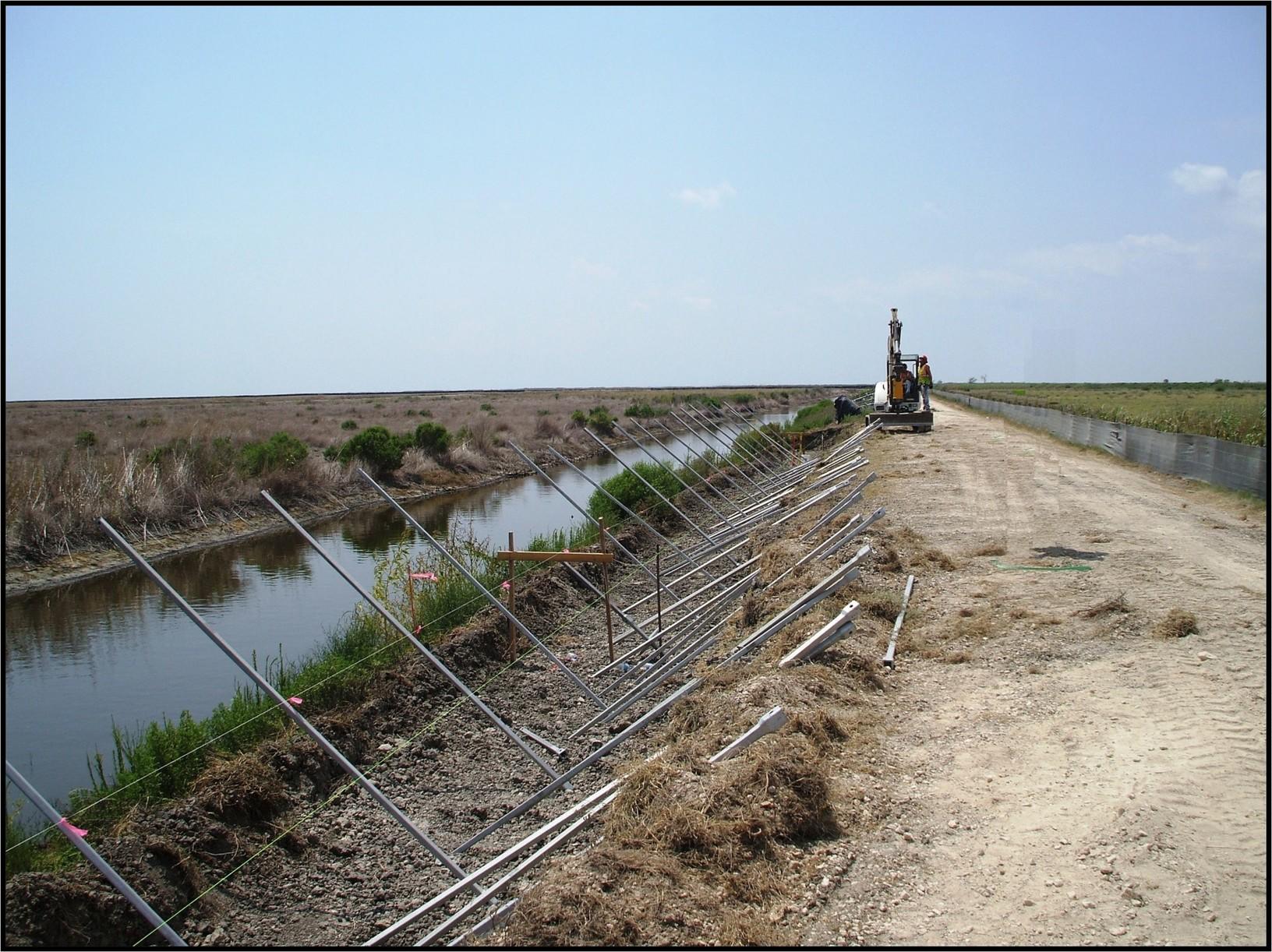 Located along the Gulf coast of Texas near Houston, the Anahuac National Wildlife Refuge encompasses 34,000 acres of protected coastal marsh and prairies. In 2008, Hurricane Ike damaged a significant portion of the existing unpaved roadways within the refuge, which were temporarily repaired. A 2.5 mile stretch of unpaved scenic roadway surrounding Shoveler Pond included six pullover viewing areas which required improvements for vehicle access. Erosion from tidal and storm activity would need to be mitigated along the roadway prior to any improvements. A comprehensive improvement plan was developed and approved by the U.S. Department of Transportation for this area of roadway, which included construction of a seawall along the pond side of the roadway along with raising the roadway elevation up to 2 feet prior to the placement of asphalt pavement. Soil borings were completed at each of the pullover locations and generally showed soft to stiff clay to a depth of about 10 feet underlain by stiff clay. Based on the soil conditions, tiebacks would be necessary for the lateral support of the seawall system. Access for tieback installation was complicated by the water directly adjacent to the pullover areas. The construction process was further complicated by requiring tieback installation prior to driving the vinyl sheet piling to accommodate smaller diameter holes through the sheet piling.
