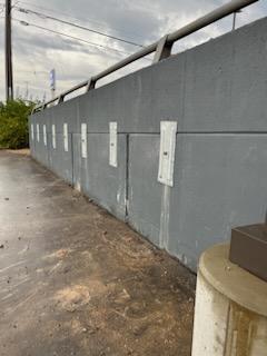 Helical tiebacks were selected for the wall stabilization because of the ability to install with smaller equipment, in limited access work areas and have a method to verify capacity during installation. Given the concerns regarding drainage behind the wall, the retained soil would be removed prior to installation of the tiebacks, which would allow placement of drainage media behind the wall. This also provided an opportunity to backfill with free draining soils. Having the retained soil removed prior to installation of the helical tiebacks also allowed installation of the tieback lead sections from behind the wall without having to core large holes through the concrete wall face. The wall loads required for the tieback design were 4.4 kips per linear foot. The design called for one row of tiebacks on 5-foot spacings installed at a 15-degree batter angle. The resulting design working tension loads on the tiebacks were 23 kips. Given the lack of geotechnical information, a factor of safety of 2.5 was used for the tieback design. Based on the tieback loading, the HA150 solid square shaft with a 10”-12” helix plate configuration was selected. The tiebacks were installed to a minimum length of 24 feet and minimum termination torques of 5,800 ft-lb to achieve torque correlated ultimate capacities of 58 kips. Actual tieback lengths ranged from 24 to 40 feet long to meet the termination torque criteria. With the 5-foot spacings, 82 tieback locations were required along the wall. The tieback installation was performed over a period of 10 days.