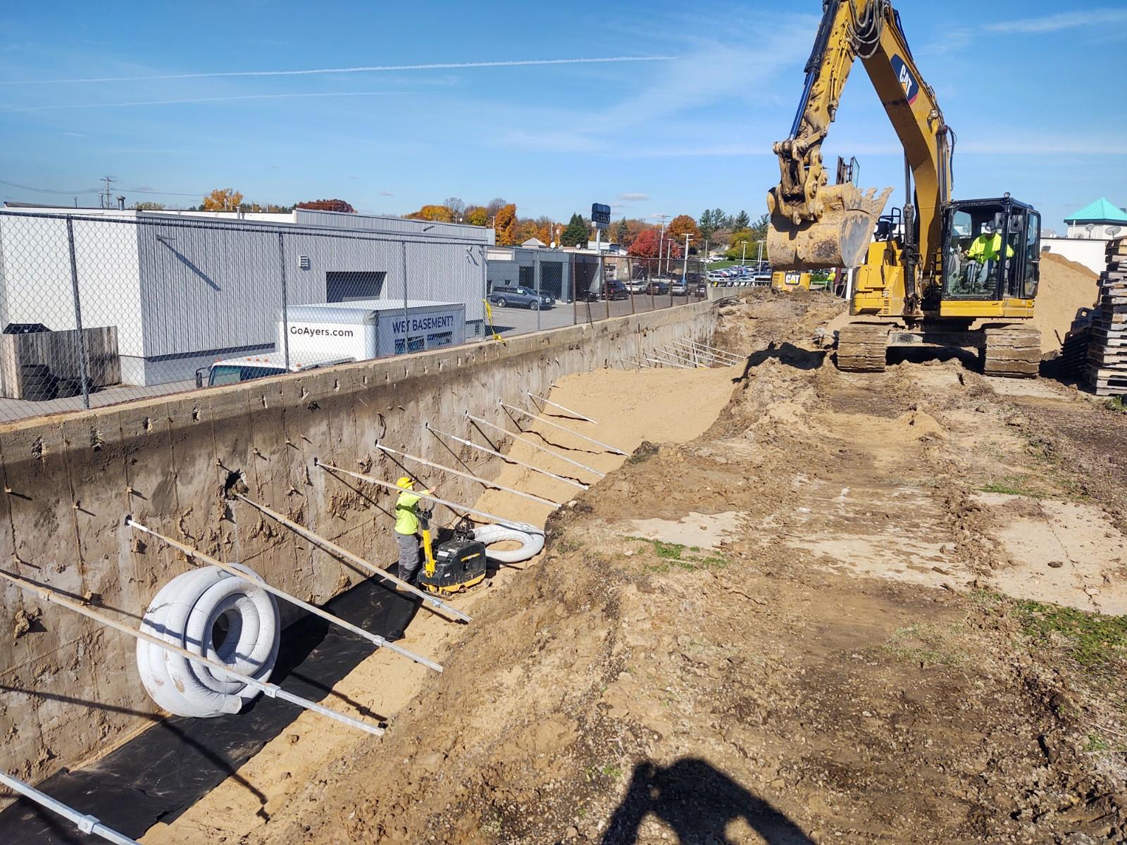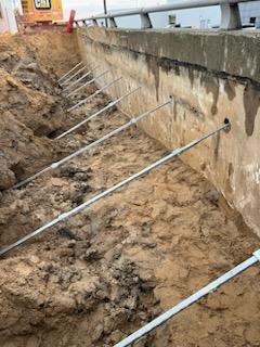 Products Installed: (82) Foundation Supportworks® Model HA150 Helical Tiebacks; Installed Minimum Lengths of 24 feet; Design Working Tension Load of 23 kips.