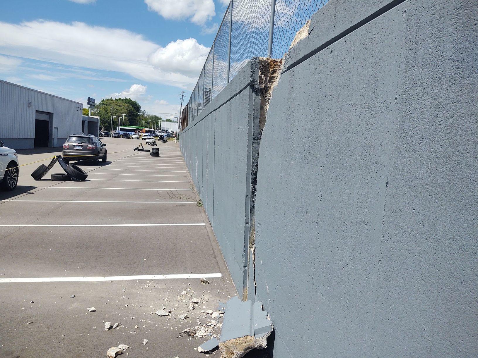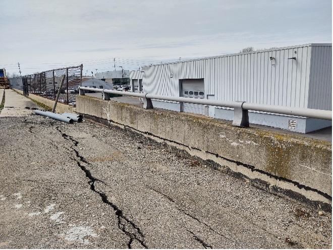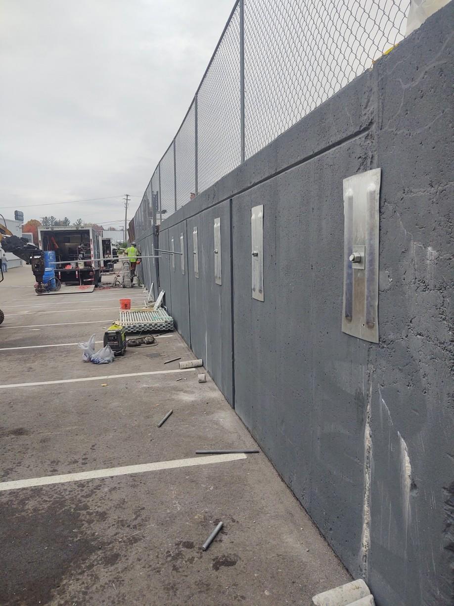 A 410-foot-long concrete cantilever retaining wall, located at 28th Street in Southeast Grand Rapids, Michigan, experienced more than 10 inches of lateral movement in some areas. The retaining wall is 16 inches thick and ranges in height from about 7 to 11 feet. There was no drainage media behind the wall and the retained soils were thought to be poorly drained, which was the likely reason for the wall movement. Concrete and asphalt pavement at the top of wall had shifted laterally with the wall movement and there was concern that a commercial building located as close as 14 feet from the top of wall, would experience movement with continued rotation of the retaining wall system. The owner of the commercial structure wanted to stabilize the retaining wall to prevent further movement. There was no geotechnical information available for the additional shoring design.
