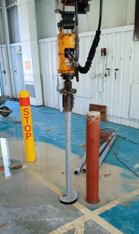 LRE partnered with RE&A Engineering in 2021 to develop a stabilization plan for the building. A ground penetrating radar (GPR) study was performed to document the location of the floor slab structural reinforcement and the depth of concrete cover above the reinforcement. Core samples taken from the slab showed #4 rebar with concrete thickness ranging from 4.1 to 6.2 inches in three locations. Swiss Hammer tests were also performed on the slab at the three core locations which showed concrete compressive strengths ranging from 7100 to 8100 psi. All this information was used to determine the appropriate spacing for the slab deep foundation elements. Helical piers were selected as the ideal solution for both the slab and footing underpinning given the ability to install in tight locations and around existing conduits and slab reinforcement. Push Pier systems were also evaluated, but the slip-fit connection provided by the push pier couplers were considered unsuitable due to concerns regarding the voids below the slab and within the landfill debris. The final stabilization plan for the building floor slab and exterior footings included 1,038 helical pier locations. To address the conduit support at the electrical and IT rooms, deep injection of polyurethane foam was recommended for these areas to stabilize the upper soils and limit future movement. Polyurethane foam injection would also be used to fill voids below the floor slab. The Model 287 (2.875-inch O.D. by 0.203-inch wall) helical pier system with either 8”-10” or single 8-inch helix plate configurations were selected for the slab support. Slab brackets were used with the Model 287 helical piers at 914 locations. The slab piers had service compression loads (design working loads) of 5 kips and were installed on an approximate 5-foot grid to average depths of 24.2 feet. The Model 287 helical pier system with an 8”-10” helix plate configuration was used with the FS288BL2 side-load underpinning bracket at 113 exterior pier locations. Eleven of the exterior footing piers were eliminated from the original stabilization plan due to electrical and/or drainage line conflicts. The exterior footing piers had service compression loads of 10 kips and were installed to average depths of 23.2 feet. The slab and exterior footing helical piers were installed to torque-correlated ultimate capacities of at least two times the service load. The pier installation occurred over a nine-month period with multiple phases of work required to allow the business to continue operation without interruption. After the slab pier installation was complete, a self-leveling grout overlay was applied to level the slab surface. The conduit stabilization at the electrical and IT rooms consisted of 24 locations for deep injection of polyurethane foam with injection pipe lengths of 3, 7 and 14 feet. PolyLevel® PL400 was the chosen foam for the application, given its high strength, fast reaction time, low weight, and hydrophobic properties. The slab was monitored at several locations for movement during the foam injection process. A total of 860 pounds of PolyLevel PL400 polyurethane foam was injected over a two-day period.
