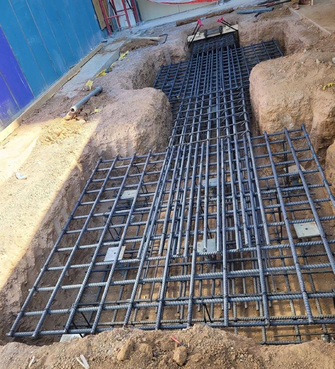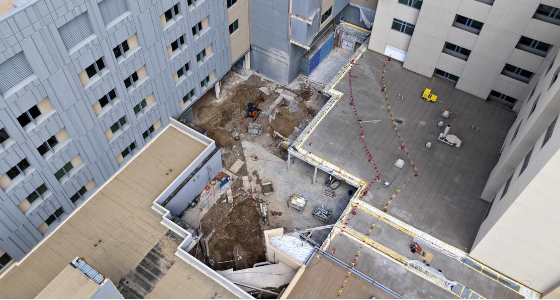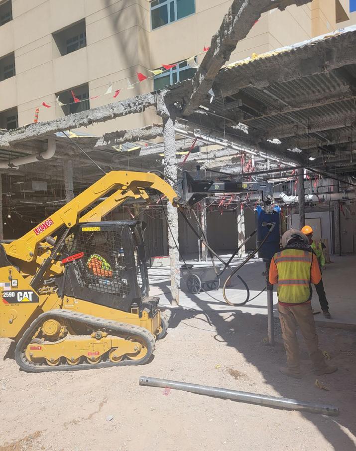 Given the access limitations, helical piles were selected as the most multi-campus medical clinic and tertiary medical center. An expansion to the hospital was planned as part of a five-year project that included the construction of an approximate 583,800 square foot addition to the west side of the hospital along with additions and renovations to other existing support facilities. Part of the center’s expansion was in a courtyard area surrounded by existing structures with no access for large construction equipment. This part of the project was for an elevated walkway addition which required foundations to handle loads from nine column locations with service compression loads ranging from 56 kips to 326 kips and one column with a service tension load of 67 kips. The closest soil boring to the project area showed 6 feet of medium dense clay fill underlain by loose to medium dense sand to a depth of 9 feet where it transitioned to very stiff to hard clay to the termination of boring depth of 61.5 feet. Because of the high column loading, space limitations and poor subgrade soil conditions, the column support in this area required a deep foundation system. Aerial view of the project area with no equipment access economical solution for deep foundation support at the column locations. Four different pile cap layouts were designed with helical pile quantities of either 4, 6, or 9 piles per cap. The resulting individual helical pile loads ranged from 7.5 kips in tension to 37 kips in compression. Two different helical pile configurations were used at the pile caps; the Model HP288 (2.875-inch OD by 0.276-inch wall) system with an 8”-10” helix plate configuration and the Model HP350 (3.5-inch OD by 0.340-inch wall) system with a 10”-12”-14” helix plate configuration. The original concrete pile cap design included a total of 53 helical piles with new construction brackets. The project required installation equipment with a drive head capable of at least 11,000 ft-lb of torque. The project was bid with the assumption that the installation equipment could be placed into the project area by crane; however, the crane capacity was subsequently derated and another solution was necessary for getting the installation equipment into the project area. Arizona Foundation Solutions coordinated getting access for a CAT 259 compact track loader and drive head to the work area through the hospital entry and corridors during off-hours.