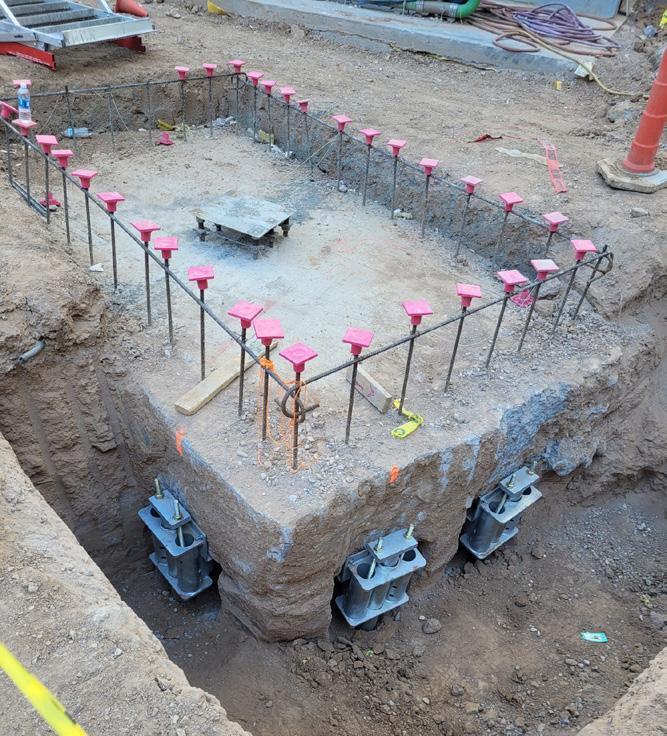 After some of the concrete pile caps were poured, it was determined that additional loading was necessary at eight of the nine pile cap locations. A combination of new construction helical piles and retrofit helical piles were used to provide the additional capacity. Four pile caps had not been poured, which allowed larger pile cap designs with additional new construction helical piles. Four of the pile caps had already been poured so retrofit helical piles were used at these locations to provide the additional capacity. A total of 6 Model HP288 and 11 Model HP350 helical piles were added to the pile cap locations with 9 of them using retrofit brackets and 8 of them using new construction brackets. Both shaft types had an 8”-10” helix plate configuration and were installed to torque-correlated ultimate capacities of at least 2 times the required service load. The second phase of work was performed in one day.
