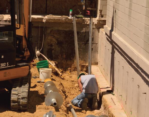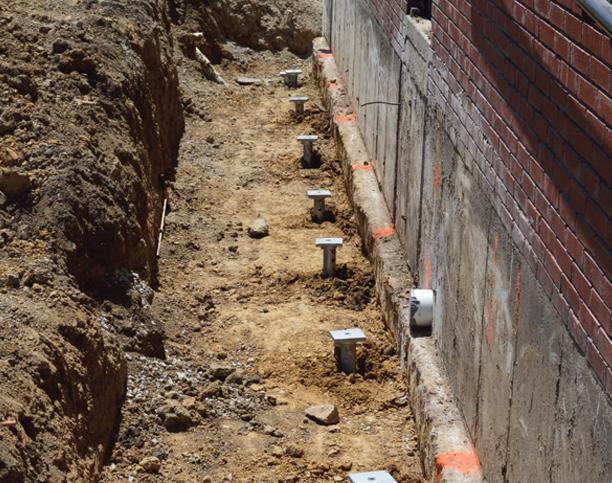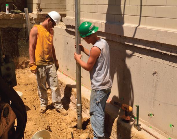 Fifteen helical piles were installed around the southeast corner of the gymnasium. The helical pile configuration consisted of Model 288 (2.875-inch OD b y 0.276-inch wall) hollow round shaft with a 10”-12”-14” triple-helix lead section followed by a 14” single-helix extension to support a design working load of 35 kips. Standard extensions advanced the piles to depths up to 40 feet below floor slab elevation to bear within the glacial till. The piles were advanced to torque-correlated ultimate capacities of at least twice the design working load (FOS ≥ 2). The piles w ere fitted with new construction brackets and cast into the new foundations. The helical pile installation was completed within two days.